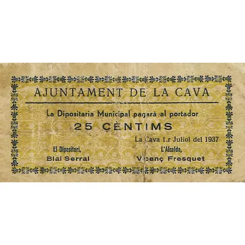 AJUNTAMENT DE LA CAVA La Dipositaria Municipal pagarà al portador 25 CÈNTIMS La Cava 1.r Juliol del 1937 (Translation: City Council of La Cava The Municipal Depositary will pay the bearer 25 Centimos La Cava, July 1, 1937) |