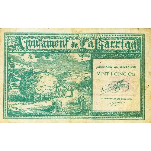 Ajuntament de La Garriga ABONARA AL PORTADOR VINT-I-CINC CTS (Translation: City Council of La Garriga Will pay the bearer Twenty five Centimos) |