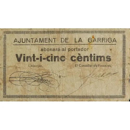 AJUNTAMENT DE LA GARRIGA abonará al portador Vint-i-cinc cèntims (Translation: City Council of La Garriga Will pay the bearer Twenty-five Centimos) |