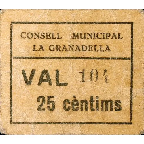 (Translation: Municipal Council la Granadella It`s worth 25 Centimos)