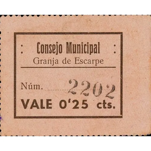 Consejo Municipal Granja de Escarpe Núm. ... VALE 0`25 cts. (Translation: Municipal Council Granja de Escarpe It`s worth 0.25 Centimos) |