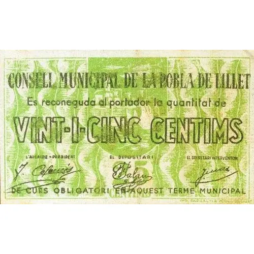 | Obverse lettering | CONSELL MUNICIPAL DE LA POBLA DE LILLET Es reconeguda al portador la quantitat de VINT-I-CINC CENTIMS DE CURS OBLIGATORI EN AQUEST TERME MUNICIPAL (Translation: Municipal Council of La Pobla de Lillet The amount of Twenty-five Centimos is recognized to the bearer Of mandatory course in this Municipal term) |