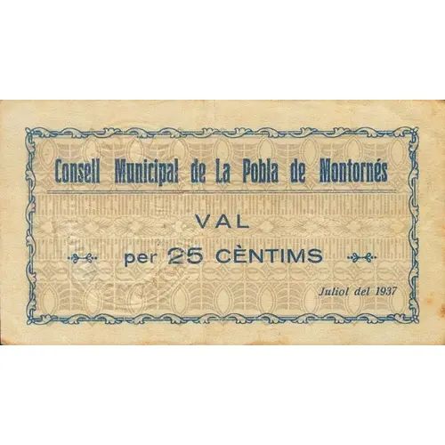 Consell Municipal de La Pobla de Montornés VAL per 25 CÈNTIMS Juliol del 1937 (Translation: Municipal Council of La Pobla de Montornés Valid for 25 Centimos July 1937) |