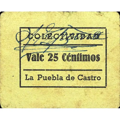 COLECTIVIDAD Vale 25 Céntimos La Puebla de Castro (Translation: Collectivity It`s worth 25 Centimos La Puebla de Castro) |