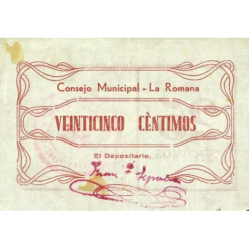 Consejo Municipal - La Romana VEINTICINCO CÉNTIMOS El Depositario (Translation: Municipal Council - La Romana Twenty-five Centimos The Depositary) |