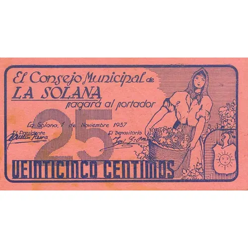 El Consejo Municipal de LA SOLANA pagará al portador VEINTICINCO CENTIMOS La Solana, 1 de Noviembre 1937 (Translation: The Municipal Council of La Solana Will pay the bearer Twenty-five Centimos La Solana, November 1, 1937) |