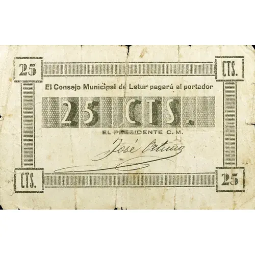 25 CTS. El Consejo Municipal de Letur, pagará al portador 25 CTS. (Translation: 25 Centimos The Municipal Council of Letur will pay the bearer 25 Centimos) |