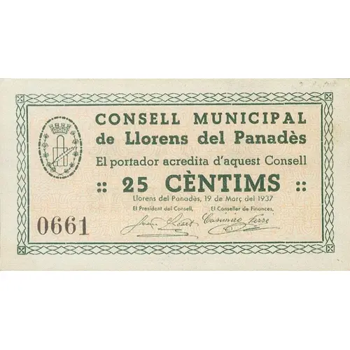 CONSELL MUNICIPAL de Llorens del Panadès El portador acredita d`aquest Consell 25 CÈNTIMS Llorens del Panadès, 19 de Març del 1937 (Translation: Municipal Council of Llorens del Panadès The bearer accredits this Council 25 Centimos Llorens del Panadès, March 19, 1937) |