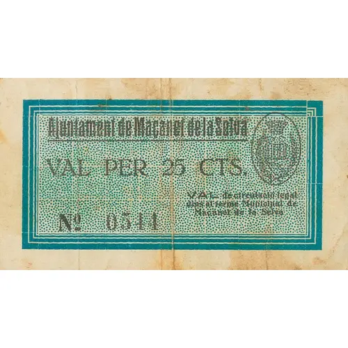 (Translation: City Council of Maçanet de la Selva Valid for 25 Centimos Voucher of legal circulation within the municipality of Maçanet de la Selva)