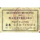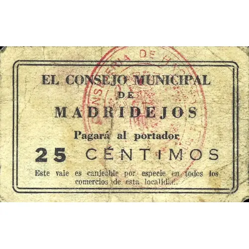 | Chữ khắc mặt trước | EL CONSEJO MUNICIPAL DE MADRIDEJOS Pagará al portador 25 CENTIMOS Este vale es canjeable por especie en todos los comercios de esta localidad. (Translation: The Municipal Council of Madridejos Will pay the bearer 25 Centimos This voucher is redeemable in goods at all businesses in this town.) |