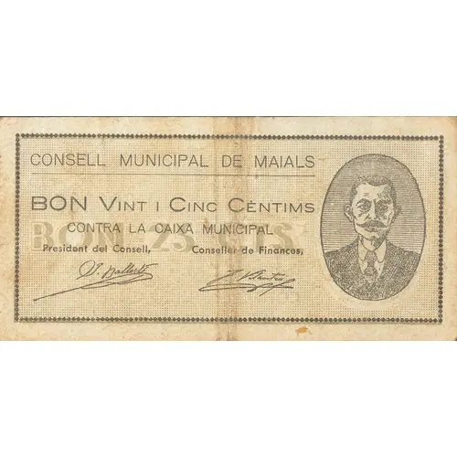 BON 25 cèntims EMISSIÓ: 1.er JULIOL 1937. CONSELL MUNICIPAL DE MAIALS (Translation: Bond 25 Centimos Issue: Luly 1, 1937. Municipal Council of Maials) |