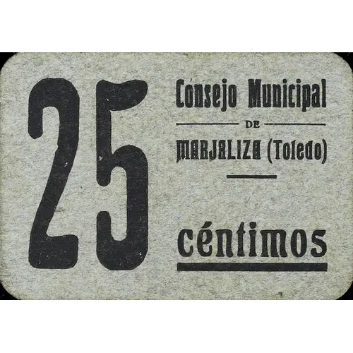 Consejo Municipal DE MARJALIZA (Toledo) 25 céntimos (Translation: Municipal Council of Marjaliza (Toledo) 25 Centimos) |
