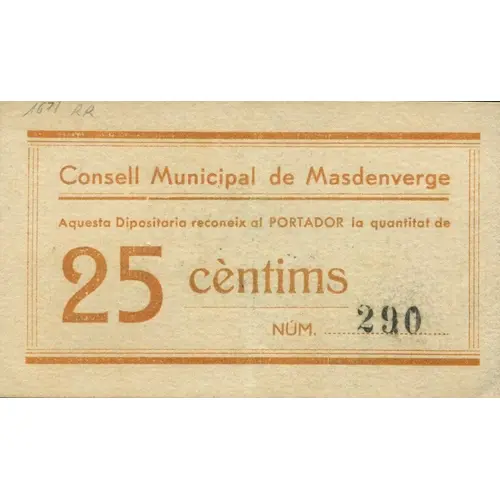 Consell Municipal de Masdenverge Aquesta Dipositaria reconeix al PORTADOR la quantitat de 25 cèntims (Translation: Municipal Council of Masdenverge This Depository recognizes to the bearer the amount of 25 Centimos) |