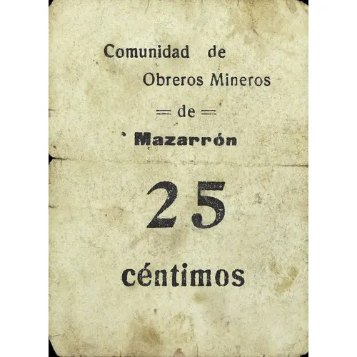 | Vorderseitenlegende | Comunidad de Obreros Mineros = de = Mazarrón 25 céntimos (Translation: Community of Mining Workers of Mazarrón 25 Centimos) |
