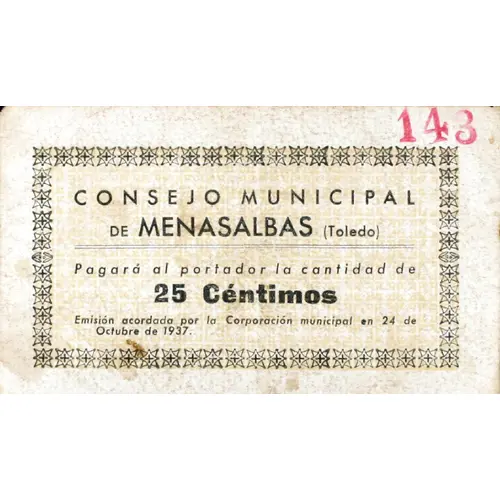 CONSEJO MUNICIPAL DE MENASALBAS (Toledo) Pagará al portador la cantidad de 25 Céntimos Emisión acordada por la Corporación municipal en 24 de Octubre de 1937. (Translation: Municipal Council of Menasalbas Will pay the bearer the amount of 25 Centimos Issue agreed by the Municipal Corporation on October 24, 1937.) |
