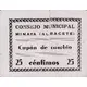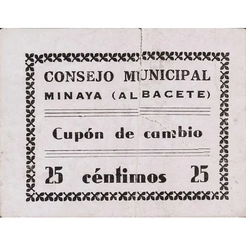 CONSEJO MUNICIPAL MINAYA (ALBACETE) Cupón de cambio 25 céntimos 25 (Translation: Municipal Council Minaya (Albacete) Exchange coupon 25 Centimos 25) |