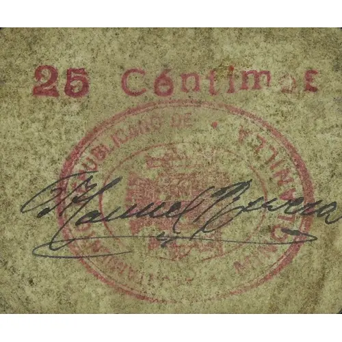 25 Céntimos AYUNTAMIENTO REPUBLICANO DE MINGLANILLA (Translation: 25 Centimos Republican City Council of Minglanilla) |