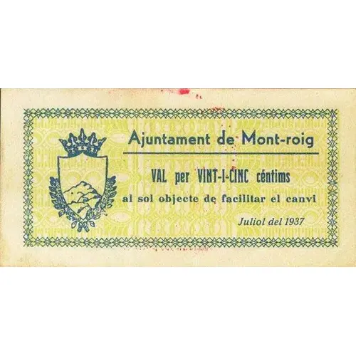 Ajuntament de Mont-roig VAL per VINT-I-CINC céntims al sol objecte de facilitar el canvi Juliol del 1937. (Translation: City Council of Mont-roig Valid for Twenty-five Centimos for the sole object of facilitating change July 1937.) |