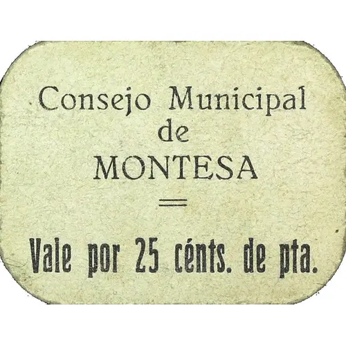 Consejo Municipal de MONTESA Vale por 25 cénts. de pta. (Translation: Municipal Council of Montesa Voucher for 25 Centimos of Peseta) |