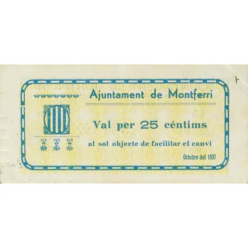 Ajuntament de Montferri Val per 25 cèntims al sol objecte de facilitar el canvi Octubre del 1937 (Translation: City Council of Montferri Valid for 25 Centimos For the sole purpose of facilitating change October 1937) |