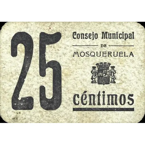 Consejo Municipal DE MOSQUERUELA 25 céntimos (Translation: Municipal Council of Mosqueruela 25 Centimos) |
