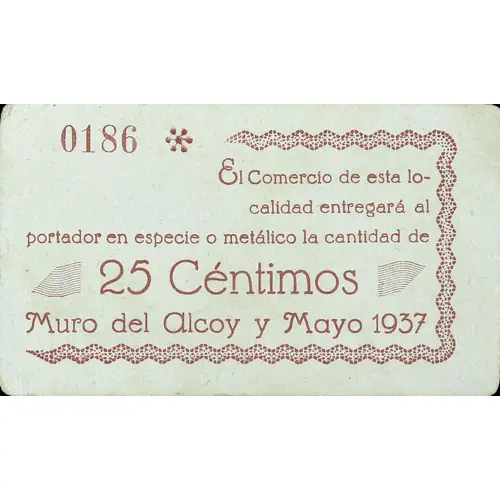 El Comercio de esta localidad entregará al portador en especie o metálico la cantidad de 25 Céntimos Muro de Alcoy y Mayo 1937 (Translation: The Commerce of this town will deliver to the bearer in kind or cash the amount of 25 Centimos Muro de Alcoy and May 1937) |