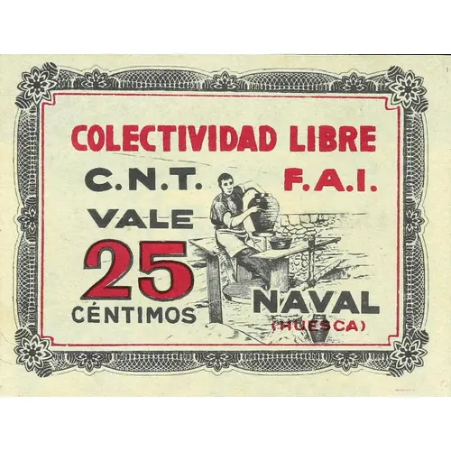 | Vorderseitenlegende | Colectividad Libre C.N.T F.A.I. VALE 25 CÉNTIMOS NAVAL (HUESCA) (Translation: Free Collectivity C.N.T F.A.I. Voucher 25 Centimos Naval (Huesca)) |
