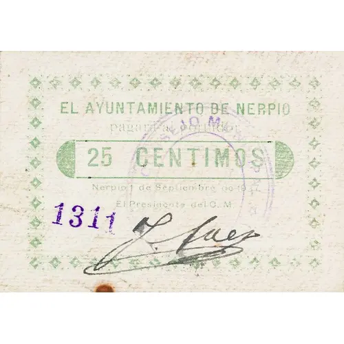 EL AYUNTAMIENTO DE NERPIO pagará al portador 25 CENTIMOS Nerpio 1 de septiembre de 1937 (Translation: The City Council of Nerpio will pay the bearer 25 Centimos Nerpio September 1, 1937) |