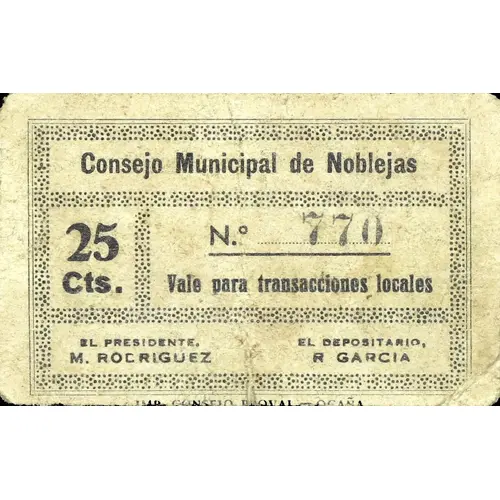 Consejo Municipal de Noblejas 25 Cts. Vale para transacciones locales (Translation: Municipal Council of Noblejas 25 Centimos Voucher for local transactions) |