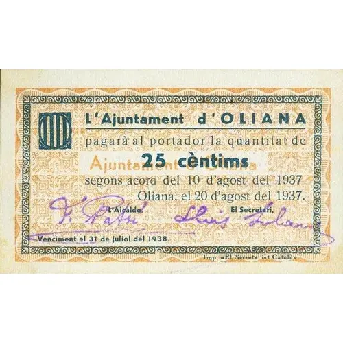 L`Ajuntament d`OLIANA pagarà al portador la quantitat de 25 cèntims segons acord del 10 d`agost del 1937 Oliana, el 20 d`agost del 1937. Venciment el 31 de Juliol del 1938. (Translation: The City Council of Oliana will pay the bearer the amount of 25 Centimos according to agreement of August 10, 1937 Oliana, August 20, 1937. Expiration on July 31, 1938.) |