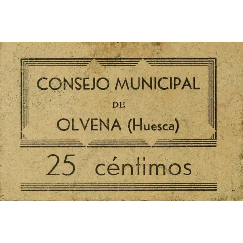 CONSEJO MUNICIPAL DE OLVENA (Huesca) 25 céntimos (Translation: Municipal Council of Olvena (Huesca) 25 Centimos) |