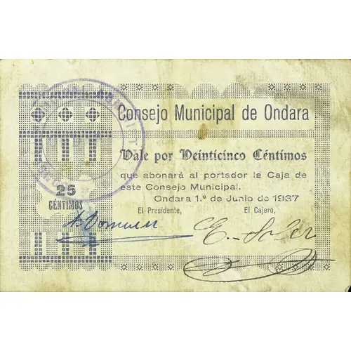 25 CÉNTIMOS Consejo Municipal de Ondara Vale por Veinticinco Céntimos que abonará al portador la Caja de este Consejo Municipal Ondara 1.º de Junio de 1937 (Translation: 25 Centimos Municipal Council of Ondara It is worth Twenty five Centimos which will be paid to the bearer by the Fund of this Municipal Council Ondara, June 1, 1937) |