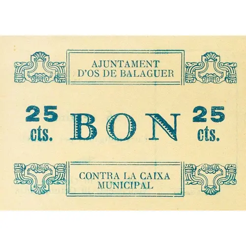 AJUNTAMENT D`OS DE BALAGUER BON / 25 cts. CONTRA LA CAIXA MUNICIPAL (Translation: City Council of Os de Balaguer Bond / 25 Centimos Against the `Caixa Municipal`) |
