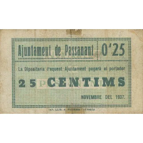 Ajuntament de Passanant 0`25 La Dipositaria d`aquest Ajuntament pagarà al portador 25 CENTIMS NOVEMBRE DEL 1937. (Translation: City Council of Passanant The Depositary of this City Council will pay the bearer 25 Centimos November, 1937) |