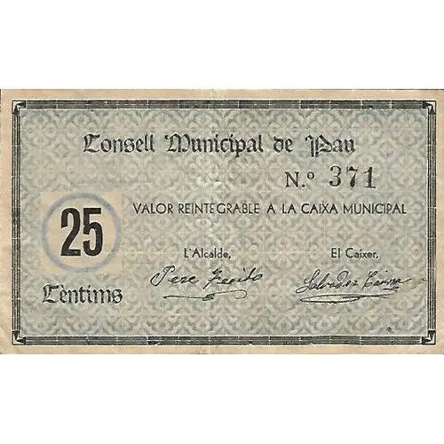 | Opschrift keerzijde | 25 Cèntims de curs obligatori dintre el terme municipal de Pau (Translation: 25 Centimos Mandatory course within the municipality of Pau) |