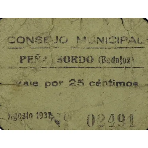 CONSEJO MUNICIPAL PEÑALSORDO (Badajoz) Vale por 25 céntimos Agosto 1937. (Translation: Municipal Council Peñalsordo (Badajoz) Voucher for 25 Centimos August 1937.) |