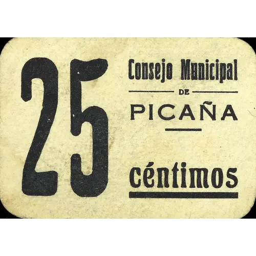 25 céntimos Consejo Municipal DE PICAÑA (Translation: 25 Centimos Municipal Council of Picaña) |
