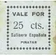 | Obverse lettering | VALE POR 25 cts. Salinera Española PINATAR (Translation: Voucher for 25 Centimos Spanish Salt Mine Pinatar) |