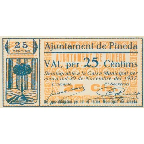 25 CÈNTIMS Ajuntament de Pineda VAL per 25 Cèntims Reintegrable a la Caixa Municipal per acord del 20 de Novembre del 1937. De curs obligatori per tot el terme Municipal de Pineda. (Translation: 25 Centimos City Council of Pineda Valid for 25 Centimos Reintegratable to the Municipal Treasury by agreement of November 20, 1937 Mandatory course for all the Municipal term of Pineda) |