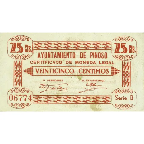 25 Cts. AYUNTAMIENTO DE PINOSO CERTIFICADO DE MONEDA LEGAL VEINTICINCO CENTIMOS (Translation: 25 Centimos City Council of Pinoso Legal currency certificate Twenty-five Centimos) |