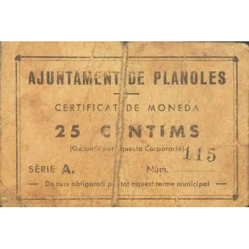 Obverse lettering AJUNTAMENT DE PLANOLES CERTIFICAT DE MONEDA 25 CÈNTIMS (Garantit per aquesta Corporació) De curs obligatori per tot aquest terme municipal