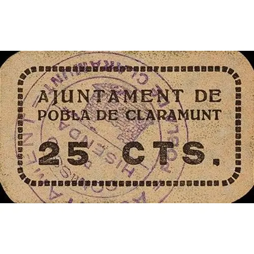AJUNTAMENT DE POBLA DE CLARAMUNT 25 CTS. (Translation: City Council of Pobla de Claramunt 25 Centimos) |