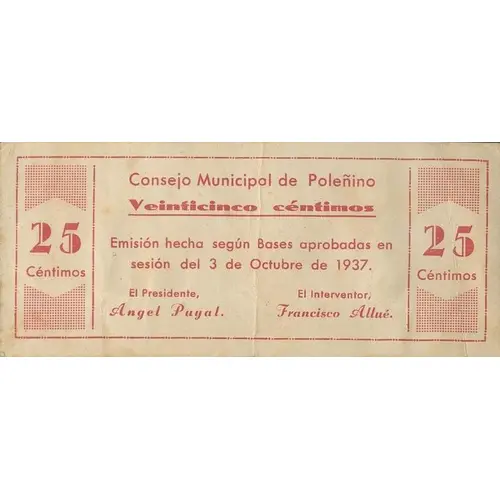 25 Céntimos Consejo Municipal de Poleñino Veinticinco céntimos Emisión hecha según Bases aprobadas en sesión del 3 de Octubre de 1937. (Translation: 25 Centimos Municipal Council of Poleñino Twenty-five Centimos Issue made according to Bases approved in session of October 3, 1937.) |