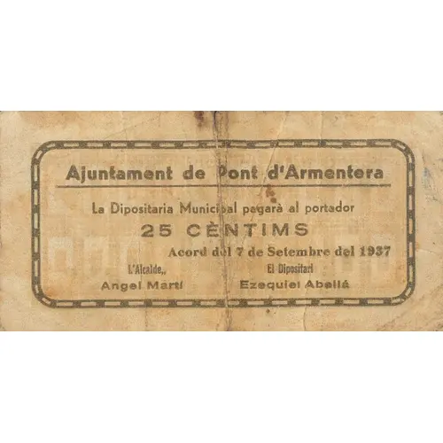 Ajuntament de Pont d`Armentera La Dipositaria Municipal pagarà al portador 25 CÈNTIMS Acord del 7 de Setembre del 1937 (Translation: City Council of Pont d`Armentera The Municipal Depositary will pay the bearer 25 Centimos Agreement September 7, 1937) |