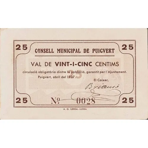 25 CONSELL MUNICIPAL DE PUIGVERT VAL DE VINT-I-CINC CENTIMS circulació obligatòria dintre de la població, garantit per l`Ajuntament. Puigvert, abril del 1937. (Translation: Municipal Council of Puigvert Voucher of Twenty-five Centimos mandatory circulation in the town, guaranteed by the City Council Puigvert, April 1937) |