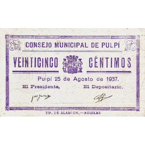 CONSEJO MUNICIPAL DE PULPÍ VEINTICINCO CÉNTIMOS Pulpí 25 de Agosto de 1937. (Translation: Municipal Council of Pulpí Twenty-five Centimos Pulpí, August 25, 1937.) |