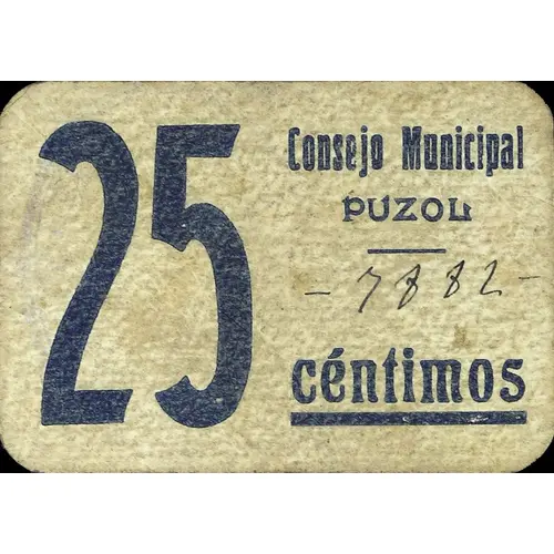 25 céntimos Consejo Municipal PUZOL (Translation: 25 Centimos Municipal Council Puzol) |