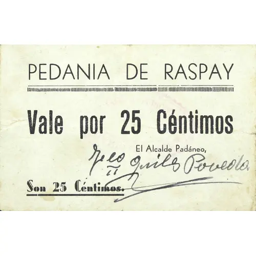 PEDANIA DE RASPAY Vale por 25 Céntimos Son 25 Céntimos (Translation: District of Raspay Voucher for 25 Centimos It`s 25 Centimos) |