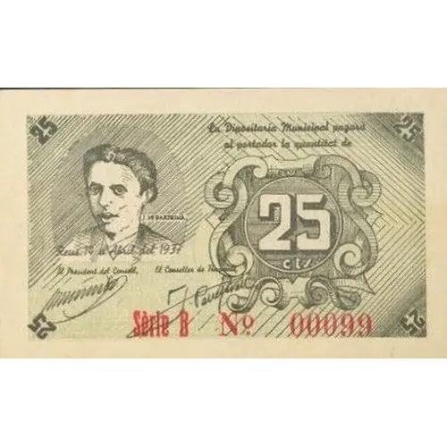 25 La dipositaria Municipal pagarà al portador la quantitat de 25 cts. Reus 14 d`Abril del 1937 (Translation: Municipal Council of Reus The Municipal Depositary will pay the bearer the amount of 25 Centimos Reus, April 14, 1937) |