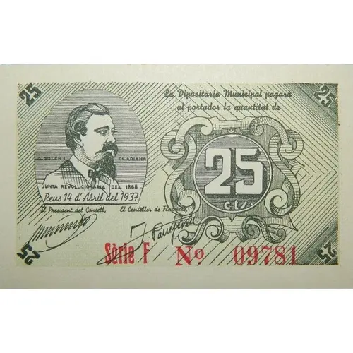 25 La dipositaria Municipal pagarà al portador la quantitat de 25 cts. Reus 14 d`Abril del 1937 (Translation: Municipal Council of Reus The Municipal Depositary will pay the bearer the amount of 25 Centimos Reus, April 14, 1937) |